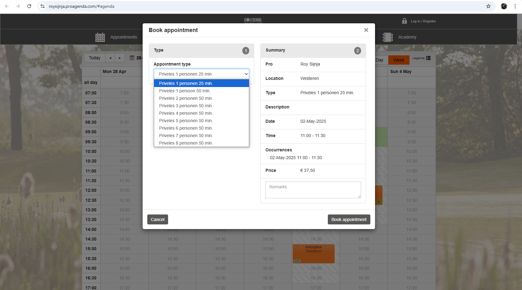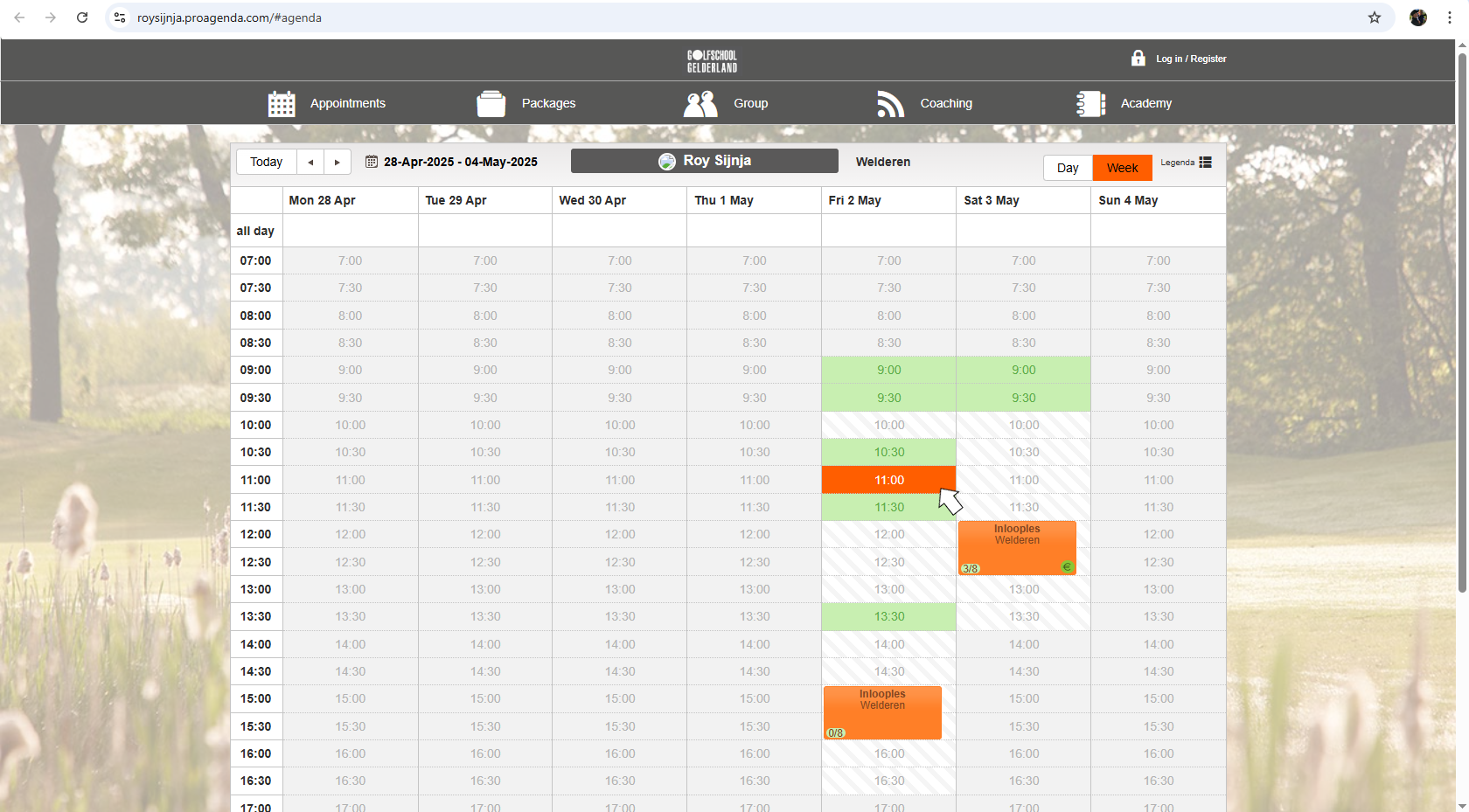 Voor een enkele les druk je op de gewenste tijd, en kies je het type les dat je wilt boeken verder wijst het programma jou door naar de betaalpagina. Je heb wel een account nodig voor het boeken van lessen.