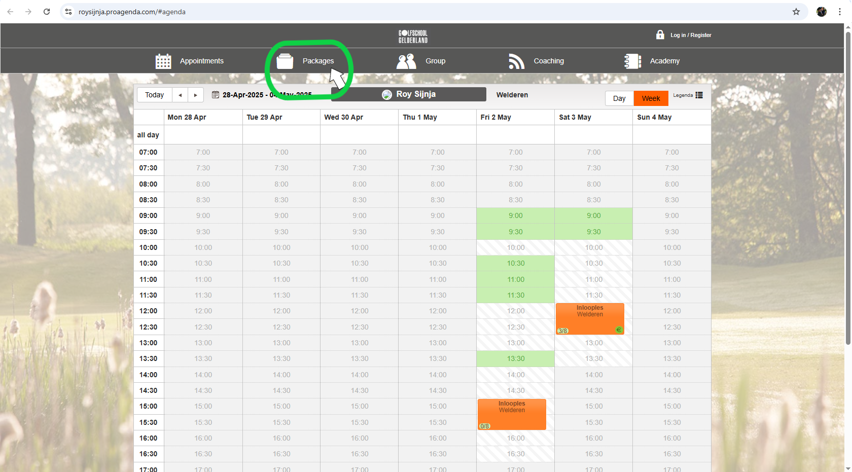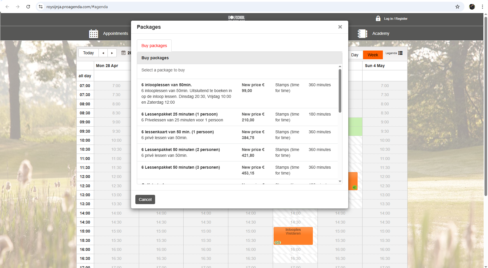 Wil je een lessen pakket aanschaffen dat druk je boven aan in de balk op Packages en kies je het pakket welke past bij jou vervolgens wijst het zich vanzelf.